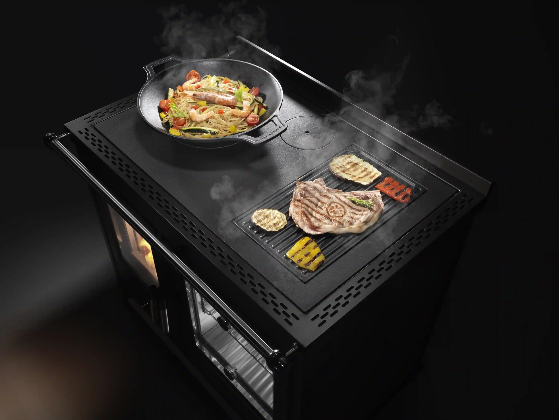 Bovenop de kachel bevindt zich een gietijzeren kookplaat met een hittebestendige emaillelaag. Deze plaat is geschikt voor dagelijks gebruik en verdeelt de warmte gelijkmatig, waardoor koken op hout overzichtelijk en controleerbaar blijft. In de kookplaat is een gietijzeren grillplaat geïntegreerd, waarmee je gerechten kunt grillen of direct kunt bereiden boven het vuur. Dit geeft extra mogelijkheden en versterkt de authentieke kookbeleving.