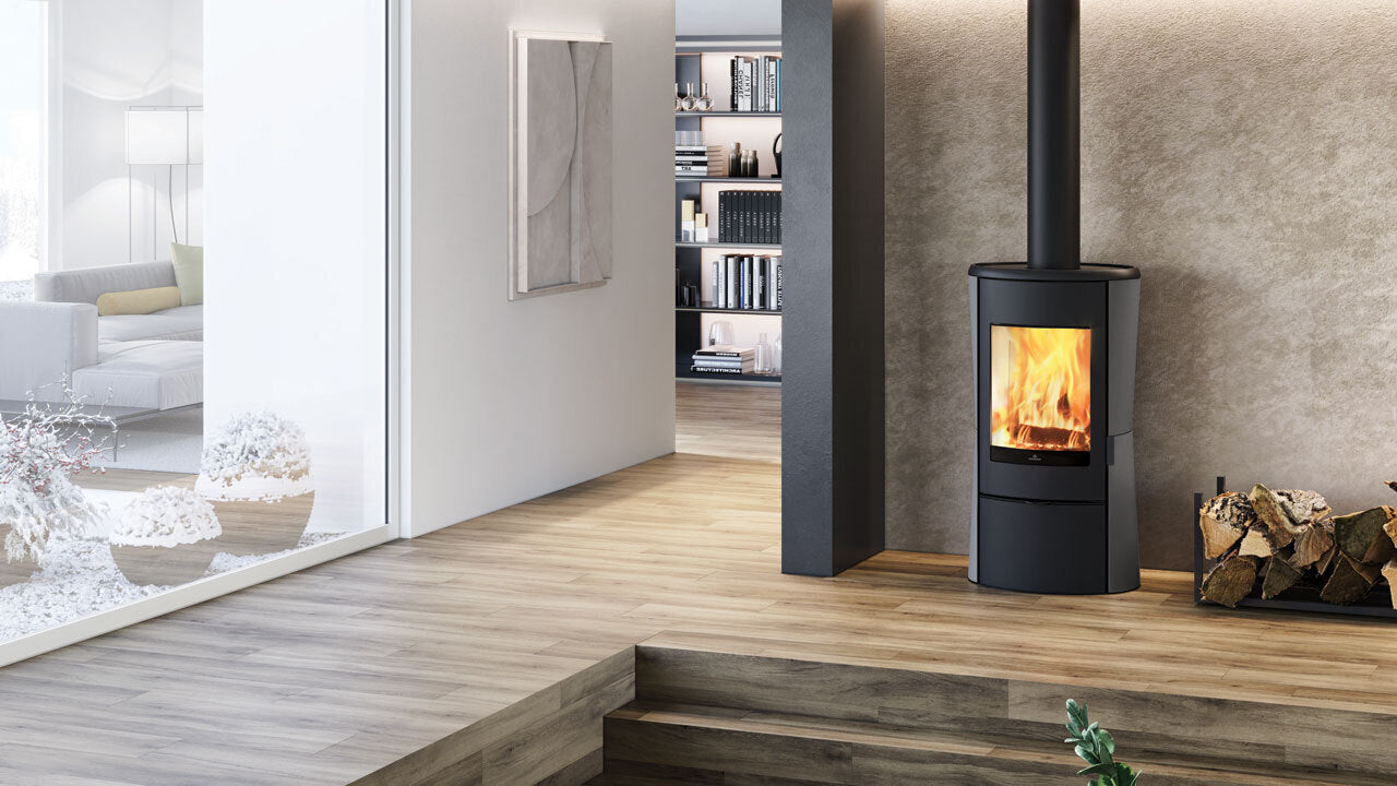 De Klass houtkachel combineert elegante lijnen met een krachtige kern. Dankzij de zandloper-vorm en de elliptische doorsnede krijgt deze vrijstaande kachel een opvallend silhouet dat perfect past in zowel moderne als klassieke interieurs. De deur en bovenplaat zijn uitgevoerd in gietijzer, met een geïntegreerde softclose-sluiting die zorgt voor een rustige, gecontroleerde bediening.